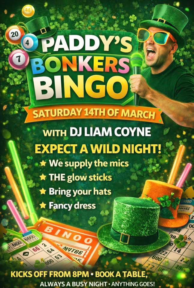 The ultimate Paddy’s Bingo special – huge cash prizes, massive jackpot, and free chip butties at halftime! Your one-stop spot for full-on Paddy’s madness.